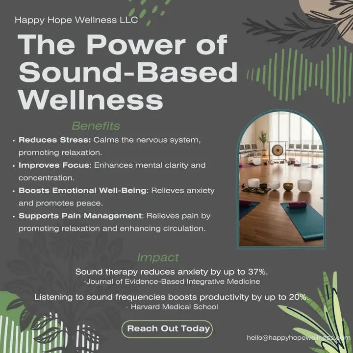 Happy Hope Wellness LLC, a veteran- owned, woman-owned business that transforms workplace and community wellness through creative, science-backed services that supports leadership resilience and holistic well-being. With offerings like workplace wellness workshops, sound healing, trauma and resilience coaching, and educational presentations, Happy Hope partners with schools, businesses, and communities to foster healing, connection, and sustainable wellness.